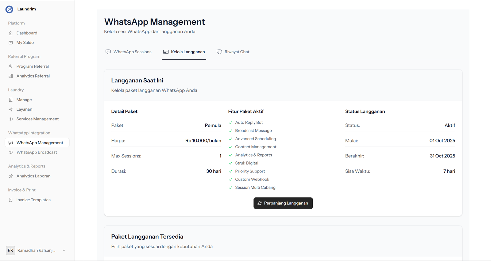 Pilih paket WhatsApp yang sesuai kebutuhan bisnis laundry Anda. Management laundry menggunakan sistem kredit di atas.