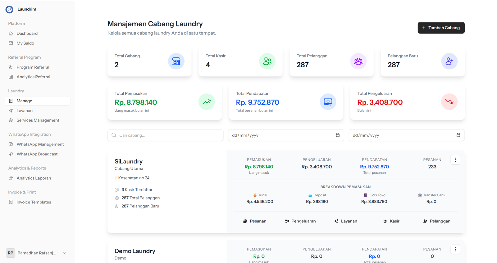 Sistem manajemen laundry yang lengkap dengan integrasi WhatsApp otomatis untuk mempermudah operasional bisnis laundry Anda.